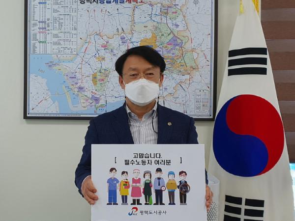 [뉴스시선집중, 김시훈기자] 평택도시공사 김재수 사장이 5일 필수노동자를 응원하는 ‘고맙습니다 필수노동자’캠페인에 동참했다.