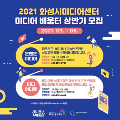 (재)화성시문화재단 화성시미디어센터는 2021년 미디어배움터 상반기 교육 프로그램으로 시민들의 미디어 역량 강화를 위한 상설교육 ‘온앤온미디어’와 미디어격차 해소를 위한 교육지원 ‘미디어디든’을 운영한다. 이번 상반기 교육은 코로나19 상황 속에서도 미디어교육을 접할 수 있는 폭을 넓히기 위해 실시간 온라인 방식으로 진행된다.
