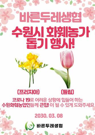 바른두레소비자생활협동조합 영통점·매탄점·천천점(관내), 동탄점·안양점·평촌점·인덕원점(관외) 매장 등에서 열린 판촉 행사에서는 수원시 내 화훼농가에서 생산한 프리지어, 튤립 등의 꽃이 판매됐다.