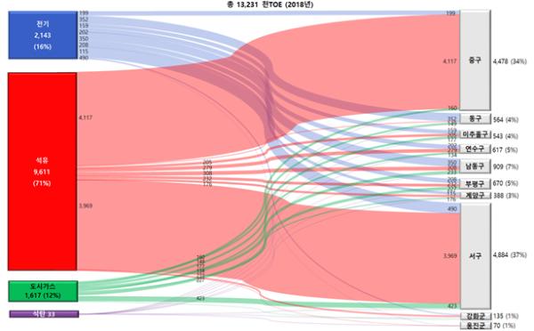군·구별로 보면 서구, 중구, 남동구 순으로 에너지 소비량이 많았고, 특히 서구에서의 납사 소비, 중구에서의 항공유 소비가 컸으며(2018년 기준), 한편 서구, 중구, 연수구 순으로 에너지 소비가 빠르게 증가했다(2010~2018년 기준).