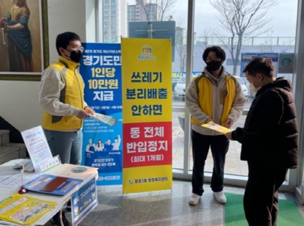 [뉴스시선집중, 윤금아기자] 수원시 영통구 망포2동은 지난 5일부터 경기도 재난기본소득을 신청하기 위해 동을 방문한 주민들 대상으로 생활폐기물 반입정지 관련사항을 집중홍보하고 있다.