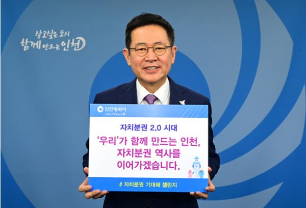 자치분권 기대해 챌린지’캠페인에 참여한 박 시장은‘자치분권 2.0 시대 우리가 함께 만드는 인천, 자치분권 역사를 이어가겠습니다’라는 문구가 새겨진 팻말을 든 사진과 응원 메시지를 자신의 사회관계망서비스(SNS)에 게시했다.