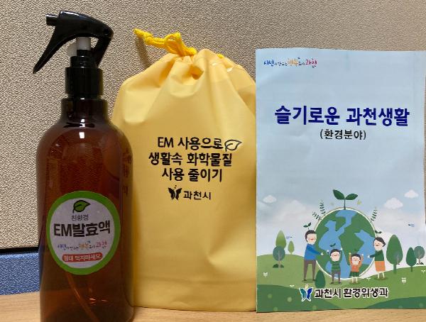 각 주민센터에서 전입신청자를 대상으로 배부되는 EM꾸러미는 과천시에서 직접 발효한 EM 500ml와 일상 생활에서의 EM 사용법, 에너지절약에 따라 포인트를 산정하여 현금으로 지급하는 탄소포인트제 가입 방법, 재활용이 불가능한 품목을 종류별로 구분하여 손쉽게 활용할 수 있는 안내문으로 구성되어 있다.