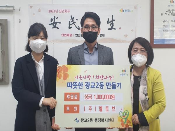 [뉴스시선집중, 윤금아기자] 지난 25일 ㈜엘토브(대표 김지성)는 코로나19로 어려움을 겪고 있는 이웃을 위해 사용해 달라며 성금 100만원을 광교2동 행정복지센터에 기탁했다.