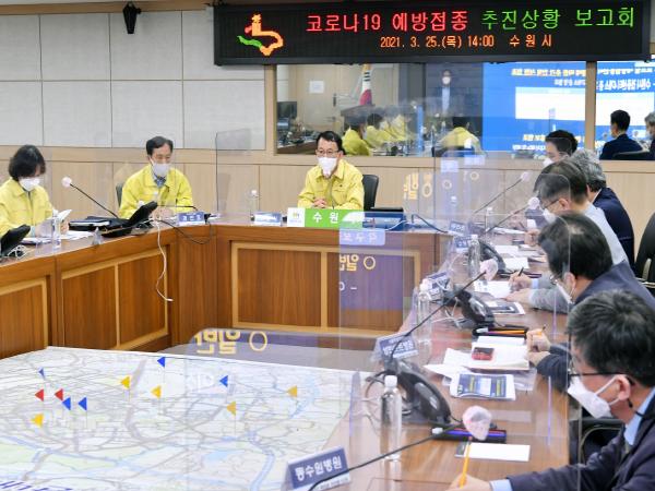 [뉴스시선집중, 윤금아기자] 조청식 수원시 제1부시장이 25일 시청 재난안전상황실에서 ‘코로나19 예방접종 추진상황 보고회’를 주재하고 있다. 이날 회의에는 수원시 예방접종추진단과 지역협의체 회원들이 참석했다.