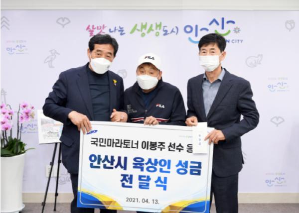 [뉴스시선집중, 김시훈기자] 안산시는 13일 안산시 육상연맹과 함께 국민 마라토너 이봉주 선수의 난치병 극복을 기원하며 모금액 총 1천529만 원을 전달했다.