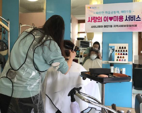 오늘 진행한 이미용서비스는 매탄1동지역사회보장협의체에서 발굴한 복지자원으로 마스크 착용, 손소독 등 개인방역 수칙을 철저히 준수한 가운데 진행했다.