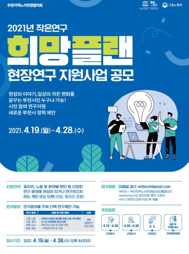 [뉴스시선집중, 박동혁기자] 부천시 노사민정협의회가 오는 19일부터 노사민정 협력 활성화를 위한 ‘작은연구 희망플랜’을 공모한다.