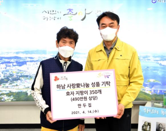 [뉴스시선집중, 이학범기자] 하남시는 지난 14일 상산곡동 소재 음식점인 ‘만두집’에서 효자지팡이 350개(490만원 상당)를 기탁했다고 밝혔다.