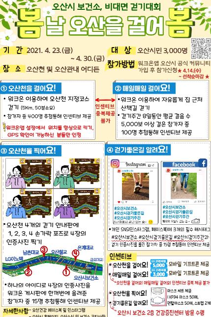 이번 비대면 걷기대회는 총 4가지의 걷기 이벤트로 구성됐다. 지정된 코스의 오산천을 걷는 ‘오산천을 걸어요!’와 시간과 장소에 구애받지 않고 걷기대회 기간동안 평균 5,000보 이상을 걷는 ‘매일매일 걸어요!’, 지정된 코스의 오산천을 걸으며 4장의 인증사진을 찍어 올리는 ‘오산천을 찍어요!’ 걷기 인증사진을 SNS에 올리는 ‘걷기좋은길을 알려요!’로 진행된다.