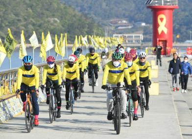 주행에 앞서 윤 시장을 비롯한 참가자들은 진도항에 세월호 참사 희생자를 기리기 위해 설치된 추모 조형물 앞에서 희생자에 대한 추모 묵념을 하기도 했다.