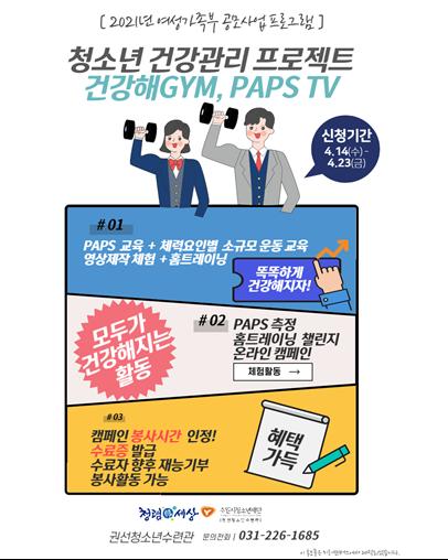 수원시청소년재단(이사장 송영완) 권선청소년수련관은 오는 5월부터 PAPS(건강체력평가)를 활용한 청소년 건강증진 프로그램인「청소년 건강관리 프로젝트-건강해GYM, PAPS TV」를 운영한다.