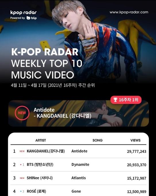 강다니엘의 신곡 ‘Antidote(안티도트)’ 뮤직비디오는 케이팝 레이더 16주차 집계 기간 (4월 11일 ~ 4월 17일) 동안 2,977만 뷰를 기록하며, 컴백과 동시에 1위의 자리에 올랐다.