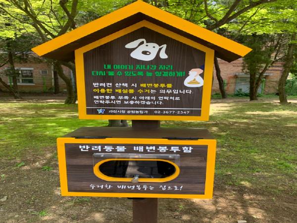 시는 반려동물과 산책 시 미리 배변통투를 준비하지 못한 시민의 불편을 최소화하고 깨끗한 공원 환경 조성을 위해 반려견 배변봉투함을 설치하였다.