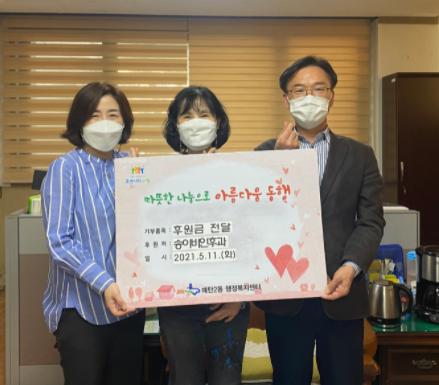 [뉴스시선집중, 윤금아기자] 수원시 원천동에 위치한 송이비인후과는 가정의달을 맞아 이웃돕기 성금 30만원을 매탄2동에 기부했다.