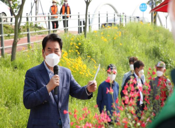 [뉴스시선집중, 이학범기자] 백군기 용인시장은 지난 22일 처인구 포곡읍 포곡중학교 앞 경안천변 광장에서 열린 봄꽃 나눔 행사장을 찾아 관계자들을 격려했다.