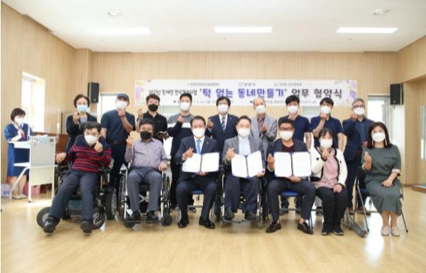 협약식에는 최대호 안양시장·이용훈 안양시장애인자립생활센터 소장·노상규 귀인동상인연합회 회장이 각 기관을 대표해 참석, 장애인의 접근성을 높여 이동권 증진 도모에 공동노력 할 것을 다짐하는‘턱없는 거리 만들기’협약서에 서명했다.