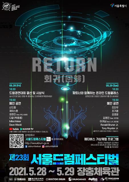 [뉴스시선집중, 최숙희기자] 올해 23차를 맞이하는 '2021 서울드럼페스티벌'이 5월 28일(금)~29일(토) 양일간 18시 30분부터 21시 20분까지 온·오프라인 동시 개최된다. 금년 행사는 코로나19 상황 속에서 방역지침을 준수한 장충체육관 현장관람과 유튜브/네이버TV 생중계가 동시에 진행된다. 코로나19 이전의 평범했던 일상으로 회귀(RETURN, 回歸)를 기원하는 마음을 담아, 모두가 힘든 시기에 드럼의 비트를 통해 축제의 에너지를 전달하고자 한다.