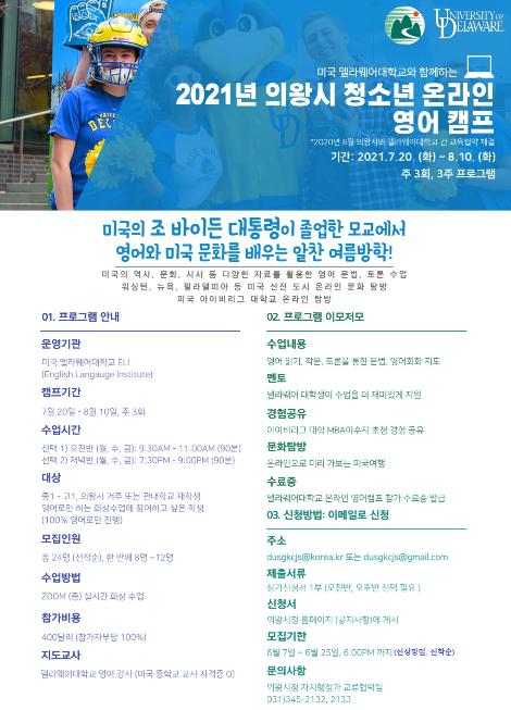 [뉴스시선집중, 박광옥기자] 의왕시가 국제 교육협력 기관인 미국 델라웨어 대학교와 함께하는‘온라인 영어캠프’참가자를 모집한다.