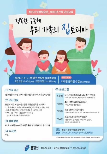 [뉴스시선집중, 이학범기자] 용인시가 코로나19로 위축된 가족 간 의사소통과 정서적 유대감 증진을 위해 자녀와 함께하는 온라인 인성교육 프로그램 ‘행복한 공동체 : 우리 가족의 집토피아’를 준비했다.
