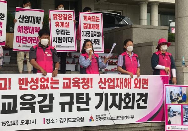 [뉴스시선집중, 박광옥기자] 전국학교비정규직노동조합 경기지부는 15일, 경기도교육청 본관 앞에서 기자회견을 갖고 최근 반복되는 산업재해사고와 관련하여 "반성없는 교육청 이재정 교육감을 규탄한다, 재발방지대책 마련하라"고 촉구했다.