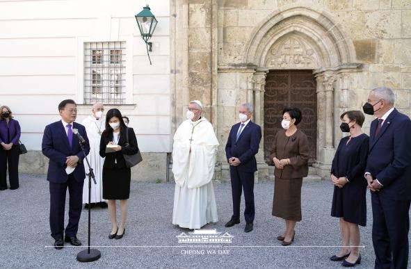 문 대통령은 “유서 깊은 중세수도원을 짧은 시간이나마 둘러 볼 수 있게 되어, 가톨릭 신자로서 특히 기쁘다”며, "바쁘신 와중에도 동행해 주신 오스트리아 대통령 내외분의 배려에 감사하다"고 말했다.