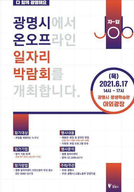 [뉴스시선집중, 박광옥기자] 광명시는 17일 오후 2시부터 5시까지 광명시 평생학습원 야외광장에서 ‘2021 광명시 온오프 일자리박람회’를 개최한다.