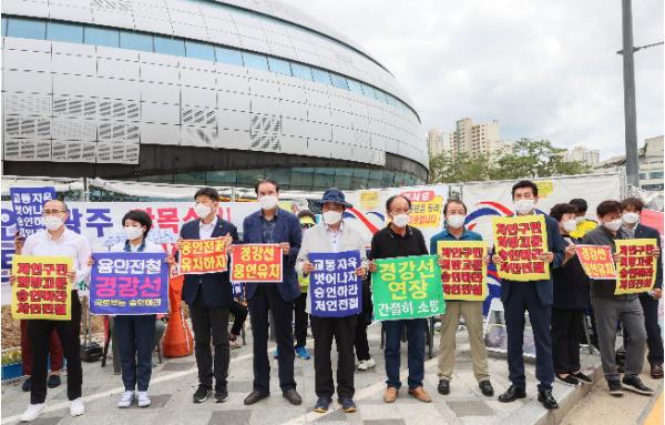 [뉴스시선집중, 이학범기자] 용인시는 16일 시민 100명이 세종시 국토교통부 청사 앞에서 4차 국가철도망 구축계획에 경강선 연장 수정안을 반영해 줄 것을 촉구하는 집회를 열었다고 밝혔다.