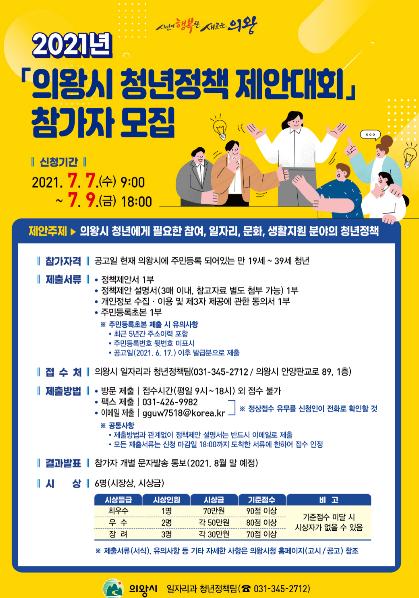 [뉴스시선집중, 박광옥기자] 의왕시가 관내 청년들을 대상으로 의왕시 청년에게 필요한 참여, 일자리, 문화, 생활지원 분야에 대한 청년정책을 주제로‘2021년 의왕시 청년정책 제안대회’를 개최한다.