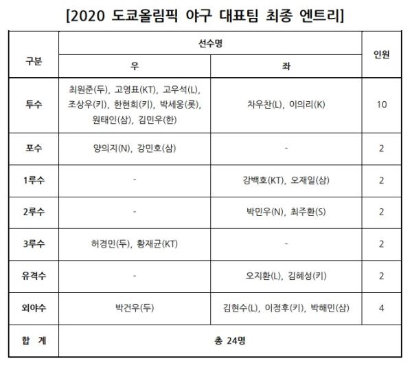 [뉴스시선집중, 임 장순기자] 2020 도쿄올림픽에 출전할 24명의 야구 대표팀 최종 명단이 확정됐다.