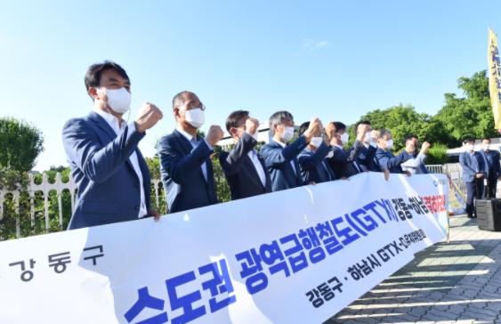 하남시와 강동구가 합동집회를 연 것은 지난달 12일 국토교통부 합동집회에 이어 두 번째다. 지난달 20일에는 부천종합운동장역에서 하남시·김포시·부천시·강동구 단체장 등이 함께 'GTX-D 원안사수 공동입장문'을 발표하기도 했다.