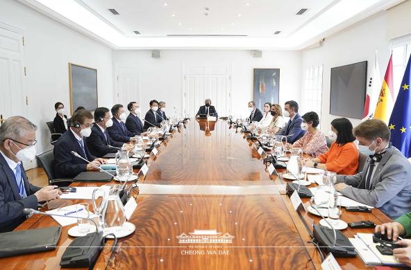 양국 간 보건협력과 관련 문 대통령은 “코로나 초기 스페인이 우리 국민들의 긴급귀국을 도와주고, 우리는 스페인에 신속 진단키트를 공급하는 등 긴밀하게 협력해왔다”면서 “코로나19의 전 세계적인 경험과 성과를 충분히 공유하고 대응 매뉴얼을 만들어나가자”고 말했다.
