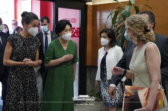김정숙 여사는 레티시아 왕비와 ‘한 개의 현실, 두 개의 시선’을 주제로 한 장애인들의 작품 전시실을 둘러보고, 창업지원공간인 ‘에스파시아’도 방문했다.