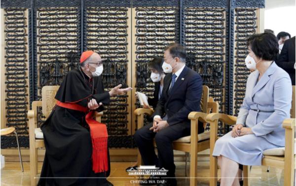 문 대통령은 "추기경님과의 만남을 통해 인종 간 화합과 평화의 연대, 그리고 코로나 팬데믹 극복을 위한 종교의 역할 등 다양한 분야에서 고견을 듣게 되었다"고 감사의 뜻을 전하며 선물을 교환했다.