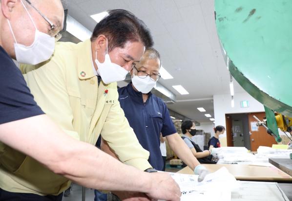 이곳을 찾은 최 시장은 10명의 근로장애인들과 같이 봉투제작 공정에 참여했다.