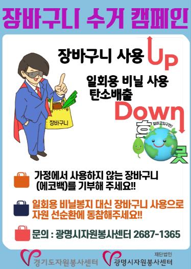 광명시자원봉사센터(센터장: 윤지연)는 경기도자원봉사센터 우수프로그램 공모사업으로 선정된‘지구의 광명을 찾는 그린뉴딜’ 사업을 통해 장바구니 수거 캠페인을 진행하고 있다.