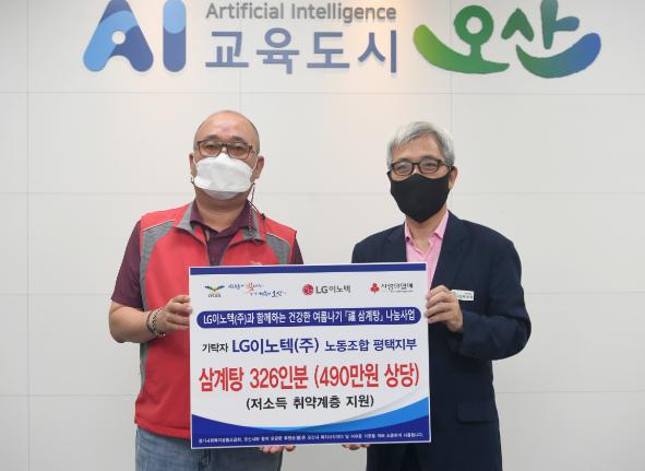 [뉴스시선집중, 박광옥기자] 오산시는 LG이노텍(주) 노동조합 평택지부(지부장 장대식)에서 10일 말복을 맞이하여 관내 취약계층 어르신들의 건강한 여름나기를 기원하는『福 삼계탕』326인분(490만원 상당)을 기탁했다고 밝혔다.