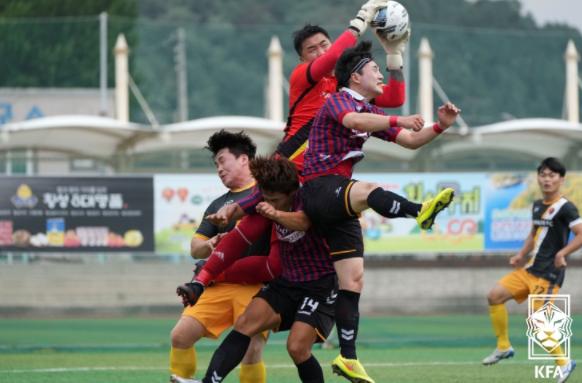 22일 횡성생활체육공원 A구장에서 열린 파란과 강원강릉시관동축구단의 2021 K5 강원권역 리그 4라운드 경기는 양 팀 모두에게 매우 중요한 경기였다. 승점 9점 동률을 이루고 있던 양 팀의 우승 향방이 갈릴 수도 있기 때문이다. 결과는 파란의 2-1 역전승. 역전승을 이룬 바탕에는 골키퍼 조상훈의 활약이 있었다.