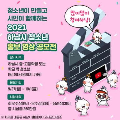 시 관계자는 “하남시 청소년들이 이번 홍보 영상 공모전을 통해 ‘청소년이 행복한 하남’ 만들기에 적극 참여해 주기 바란다”면서 “청소년들의 자발적인 공모전 참여를 통해 참신하고 다양한 홍보 소재가 발굴되길 기대한다”고 말했다.