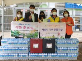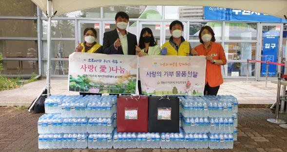 이날 전달식에는 김영숙 수원시소리샘 회장, 김미영 영통구가정어린이집연합회장, 조석환 수원시의장, 임숙자 수원시자원봉사센터장 등이 참석했으며, 후원물품 생수 1,000개와 천연염색손수건 130개는 시민의 안전과 원활한 예방접종센터 운영을 위해 헌신한 봉사자와 의료진에게 전달했다.