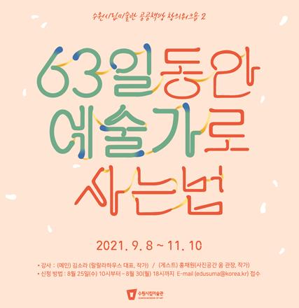 [뉴스시선집중, 윤금아기자] 경기도 수원시립미술관은 9월 8일부터 운영하는 비대면 온라인 교육프로그램 ‘공공책방 창의 워크숍’2부 '63일 동안 예술가로 사는 법'의 참가자를 오는 8월 25일부터 모집한다.