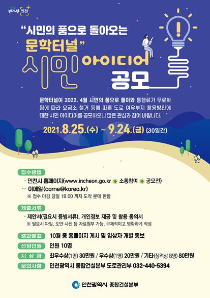 인천광역시는 오는 9월 24일까지 문학터널 통행료 무료화에 따른 구조개선 방안에 대한 시민 아이디어를 공모한다고 밝혔다.