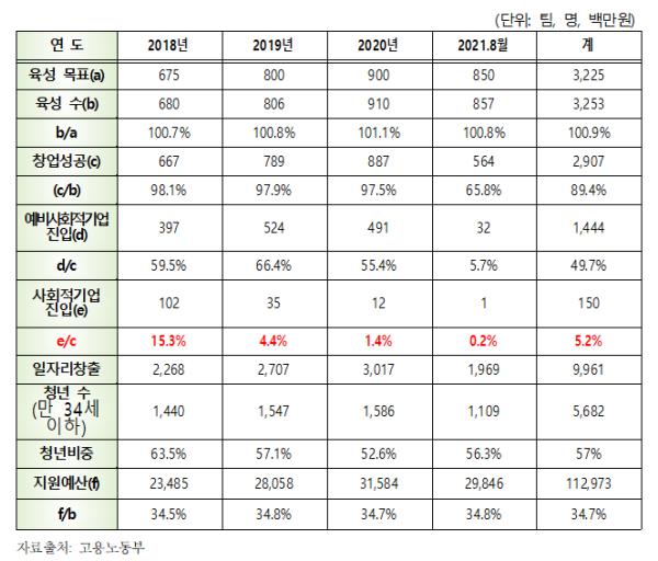 29일 국회 환경노동위원회 장철민 의원(더불어민주당/대전동구)이 고용노동부로부터 제출받은 ‘사회적기업가 육성 사업 실적’ 자료를 분석한 결과, 2018년부터 2021년 8월까지 사회적기업가 육성으로 지원된 3,253팀 중 실제 사회적기업으로 성장한 사례는 150팀(5.2%)에 불과했다.