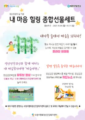 ‘내 마음 힐링 종합선물세트’는 정신건강의 날(매년 10월 10일)을 맞아 시민들이 자신의 마음 건강을 돌볼 기회를 제공하고, 정신건강에 대한 인식을 개선하기 위해 마련됐다.