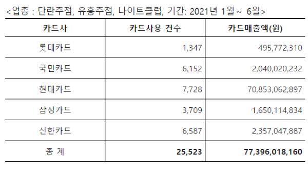 더불어민주당 오영환 의원(의정부시 갑, 행정안전위원회)이 금감원으로부터 제출받은 자료에 따르면, 올해 상반기 국내 카드사 중 매출 상위5위(국민·롯데·삼성·신한·현대) 서울·경기지역 유흥업소(단란주점·유흥주점·나이트클럽) 심야시간(밤11시~오전6시) 카드매출 분석 결과 총 25,523건 총 매출액 약773억이 발생했다.