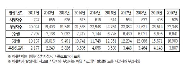 전국 이륜차 사고의 사망자 부상자를 분석한 결과, 부상자 수는 지난 10년 동안 37%가량 늘었다. 그중에서 3주 이상의 입원치료를 필요로 하는 ‘중상의 부상자 수’는 13.8%가량 감소했지만, 5일 이상 3주 미만의 치료를 필요로 하는 ‘경상 부상자 수’는 2011년과 비교해 보면 66.7%나 증가했다. 또한, 5일 미만의 치료를 필요로 하는 ‘부상 신고자 수’는 75%까지 증가한 것으로 조사됐다.