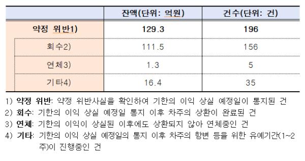 이에 196건, 129억 3천여만원이 약정위반으로 통지되었고, 이중 156건, 금액으로 111억 5천만원이 실제 상환되었다. 남은 금액 중 16억 4천만원은 차주의 항변 등으로 유예를 두었으며, 5건은(1억 3천만원) 아직 회수되지 않고, 시일을 넘겨 연체된 상황이다.