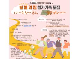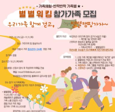 별별워킹은 10월 29일부터 11월 11일까지 14일간 진행되는 걷기미션과 스팟미션을 수행하는 프로그램으로, 걷기미션은 원하는 장소와 시간에 걸어 가족 간 누적으로 등수를 정하게 되며, 스팟미션은 왕송호수 둘레길을 걸으며 스팟장소에서 가족단체찍기, 별별질문지 미션을 수행하면 된다. 우수참가 30가족을 선정하여 상품이 지급될 예정이다.