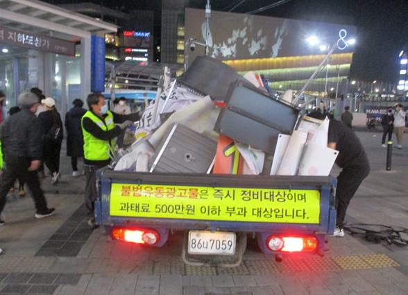 수원시 팔달구 건축과에서는 “수원시 관문인 수원역 중심상가 차없는거리에서 수원시 관광 이미지와 도시미관을 해치고 보행자의 통행을 심각히 방해하는 복잡한 인도에 설치된 불법광고물에 대하여서는 즉시 철거 및 강제 행정대집행으로 강력한 행정조치를 지속적으로 불시에 실시하며, 향후에도 난립한 불법광고물로 인해 통행을 방해하고 눈살을 찌푸리는 일이 없도록 지속적인 계고 활동 및 정비를 통해 불법광고물이 없는 쾌적한 거리 조성에 힘쓰겠다”고 밝혔다.