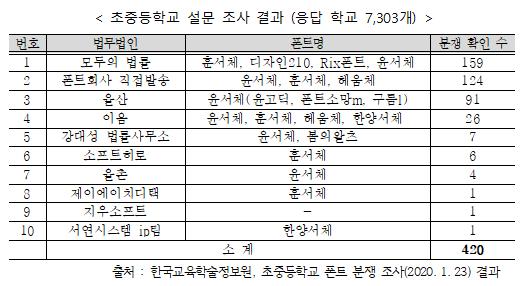 국회 교육위원회 안민석 의원(더불어민주당, 경기 오산)이 한국교육학술정보원으로부터 제출받은 ‘초·중등학교 대상 폰트 분쟁 설문조사 결과’에 따르면, 2020년 기준 420개의 학교에서 내용증명 및 고소장을 받아 저작권 분쟁에 골머리를 앓았던 것으로 나타났으며, 올해 6월 기준 교육부 지정 교육저작권지원센터에 접수된 저작권 상담 건수는 1,390건이나 된 것으로 확인됐다. 학교 또는 개인 차원에서 합의한 경우도 많아 저작권 분쟁 실태는 더 심각한 것으로 추정된다.